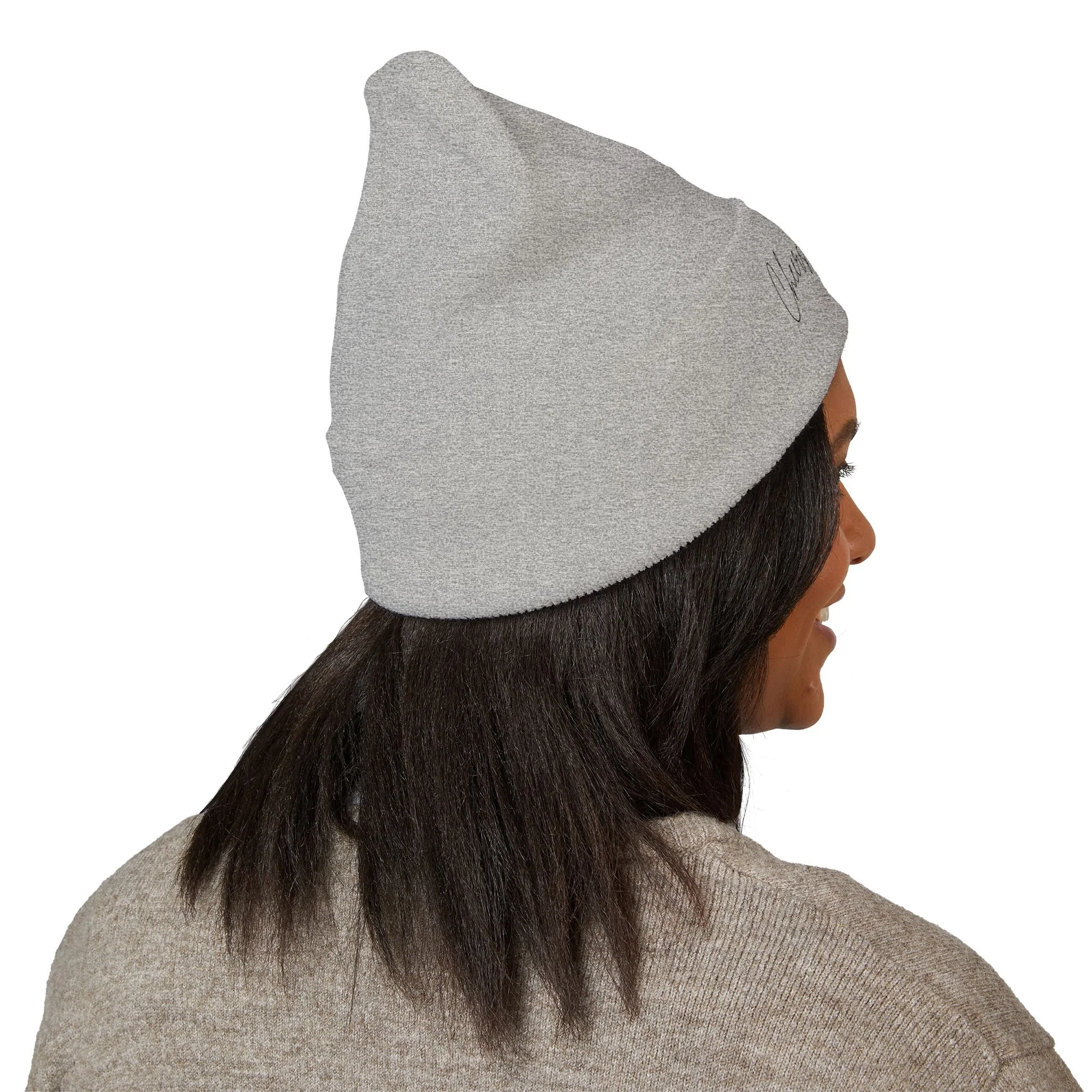 This embroidered cuffed beanie brings quiet warmth and a little spoken-word charm to chilly days. Soft, stretchy acrylic wraps your head in gentle heat while the subtle script embroidery adds a lived-in, literary touch. It sits low over your ears, tucks into a favorite coat, and keeps hair in place on windy commutes or slow weekend walks. Wear it to bookshop mornings, late-night study sessions, or small celebrations — the cuffed silhouette and understated stitch feel familiar and personal, like a handwritten note you carry with you.